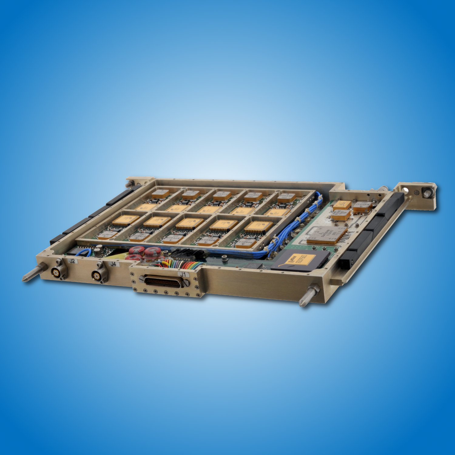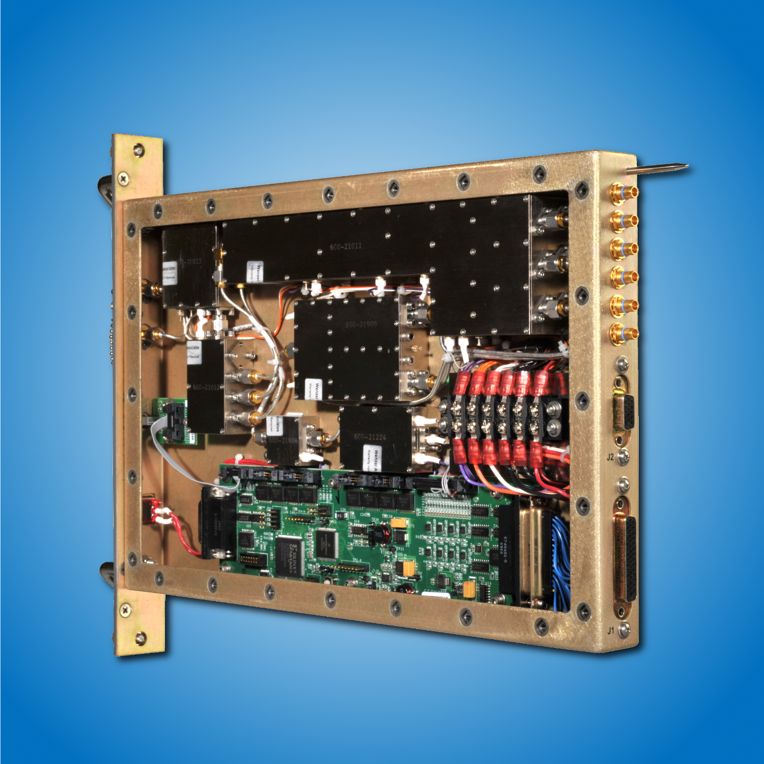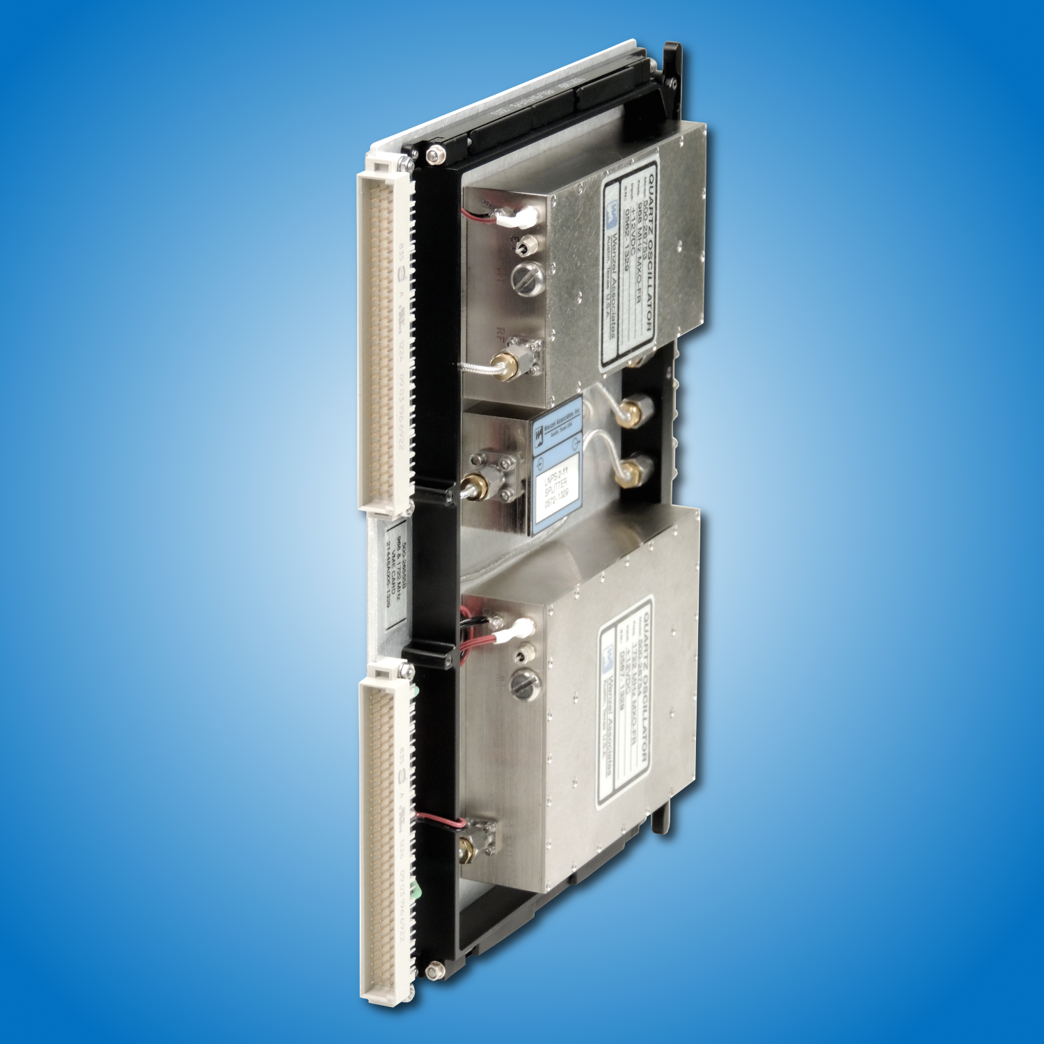 Quantic Wenzel offers card assemblies in several standard form factors (OpenVPX, VME, VXI, etc.) as well as custom configurations to provide one or multiple low noise frequencies to 16 GHz. Each card assembly is comprised of one or more industry leading Ultra Low Noise Ovenized Crystal oscillators, Blue Tops RF Modules and other hardware mounted or integrated on a card assembly, to provide a high performance frequency source with unparalleled phase noise performance. These card assemblies can be plugged into the respective backplane platform and are suitable for use as a low noise frequency source or clocking signal as a key element in a system. Custom card assemblies are available with short development time and low cost.