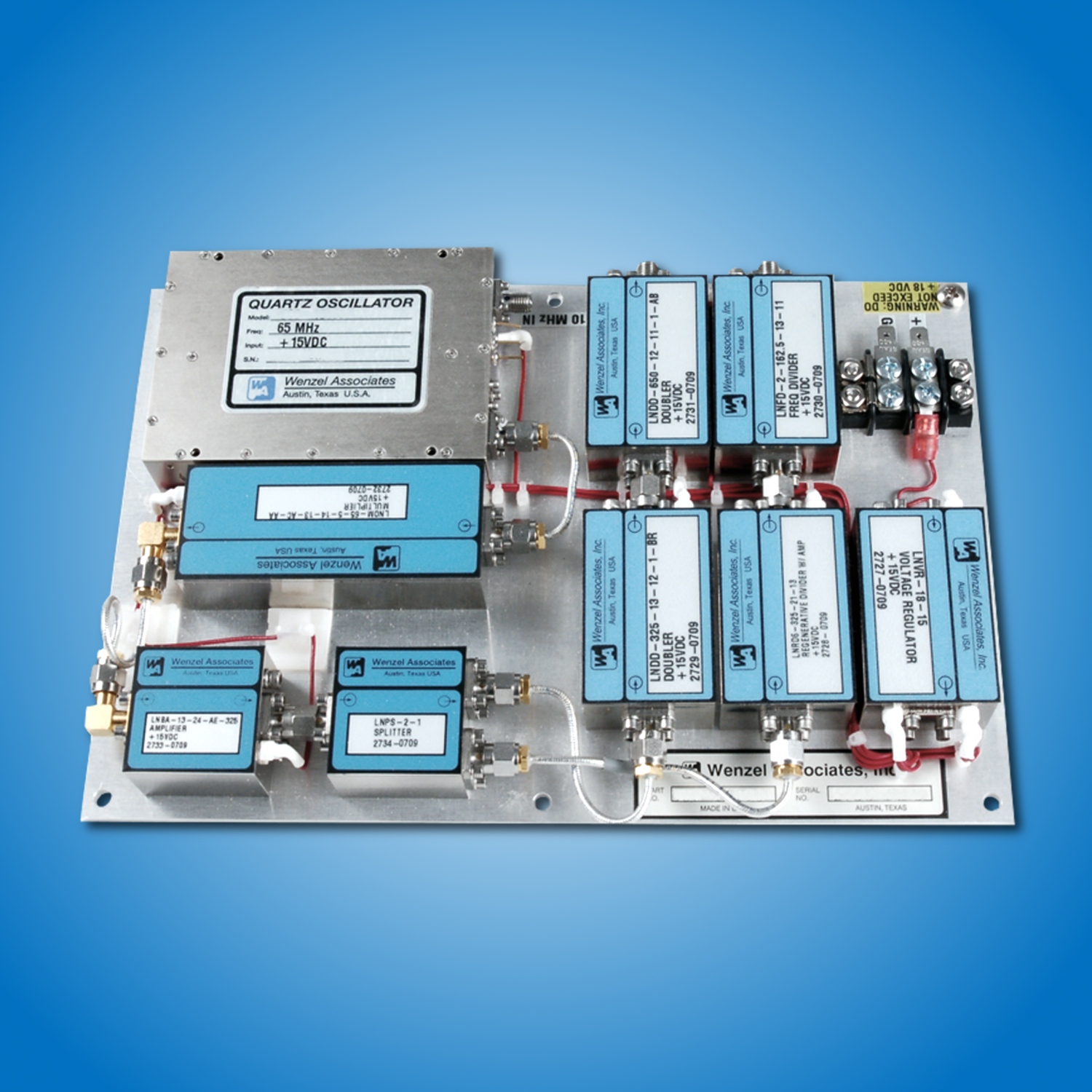 Quantic Wenzel offers plate assemblies which are comprised of one or more industry leading Ultra Low Noise Ovenized Crystal oscillators, Blue Tops RF Modules and other hardware mounted on an aluminum plate, to provide a high performance frequency source with unparalleled phase noise performance at frequencies to 16 GHz. These plates are suitable for use as a bench top frequency standard or mounting within a larger assembly as part of a system.