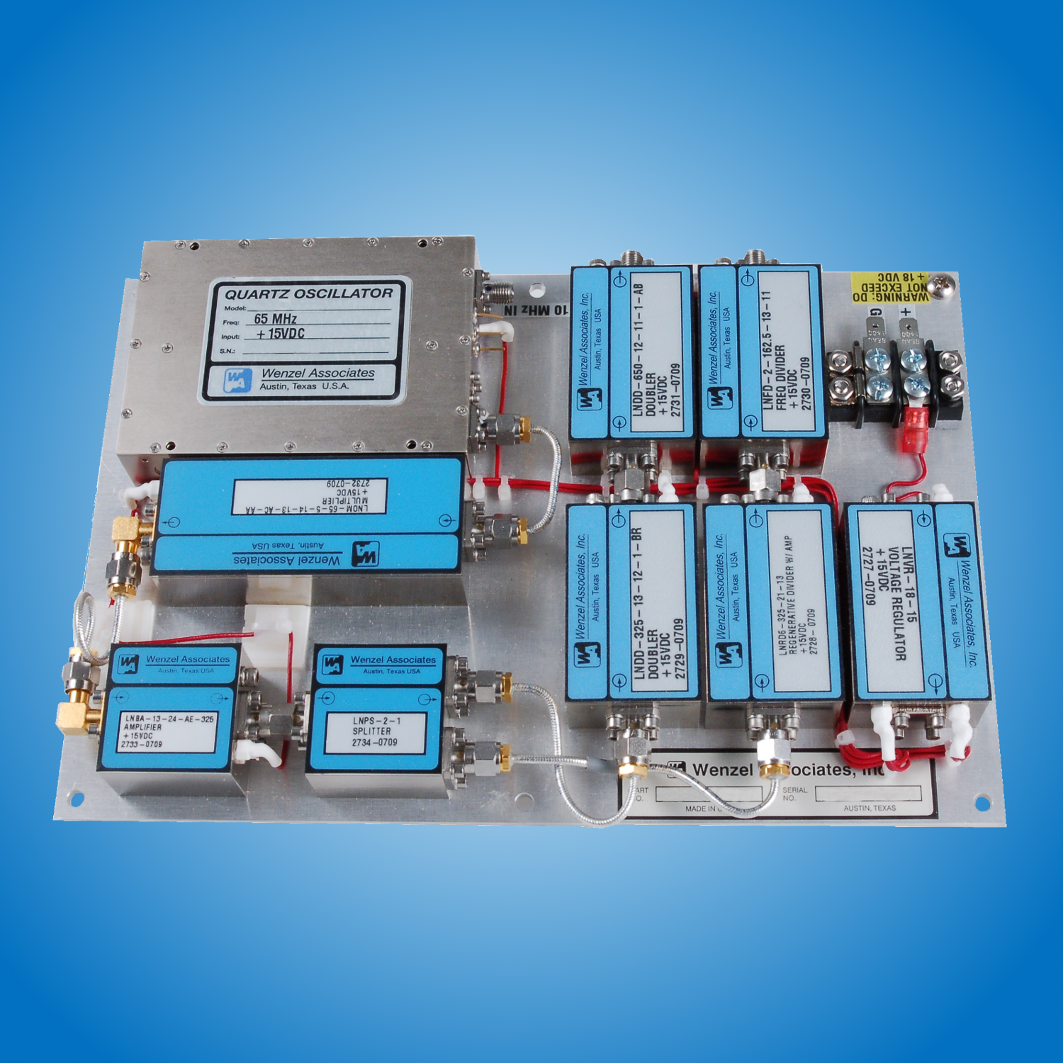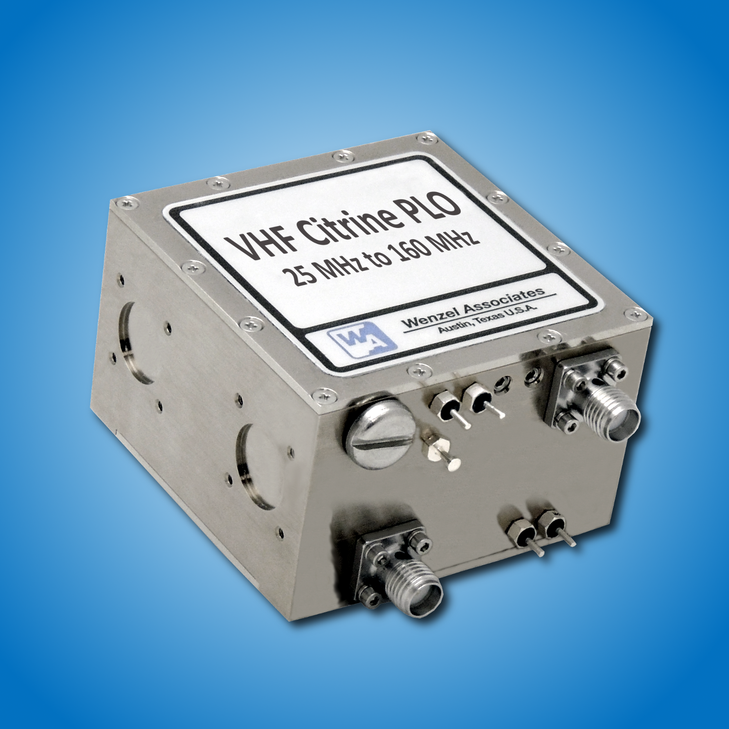 Phase Lock Crystal Oscillators are widely employed in commercial and military applications requiring a precise signal synchronized with a more stable external reference and/or improved phase noise performance. Wenzel Associates’ phase lock oscillators consist of an oven compensated low or ultra-low phase noise crystal oscillator, comparator, loop amplifier and dividers/multipliers for scaling the reference and internal oscillator signals for locking at a common frequency. When a reference is present, the comparator will produce an error voltage which is applied to the varactor of the internal oscillator, and will electrically tune the oscillator until the frequency is matched and phase locked with the reference. Wenzel offers PLO solutions with output frequencies from 5 MHz to 12 GHz. Please contact our technical staff to discuss your specific application needs.